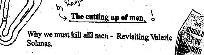"Cutting up men" manifests a whole umbrella of meanings. From the literat killing of men, their deconstruction, their transformation or, as any trans woman can relate, all of the above.