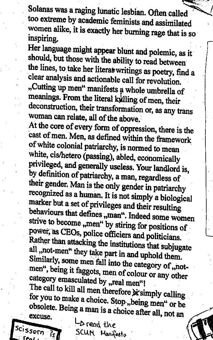 Solanas was a raging lunatic lesbian. Often called too extreme by academic feminists and assimilated women alike, it is exactly her burning rage that is so inspiring.